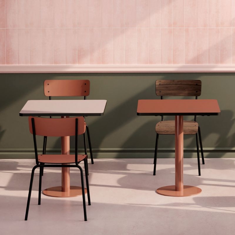 Chaise d’écolier Adulte Suzie en formica – Dossier imprimé Seventies & Assise Paprika - Pieds Bruts